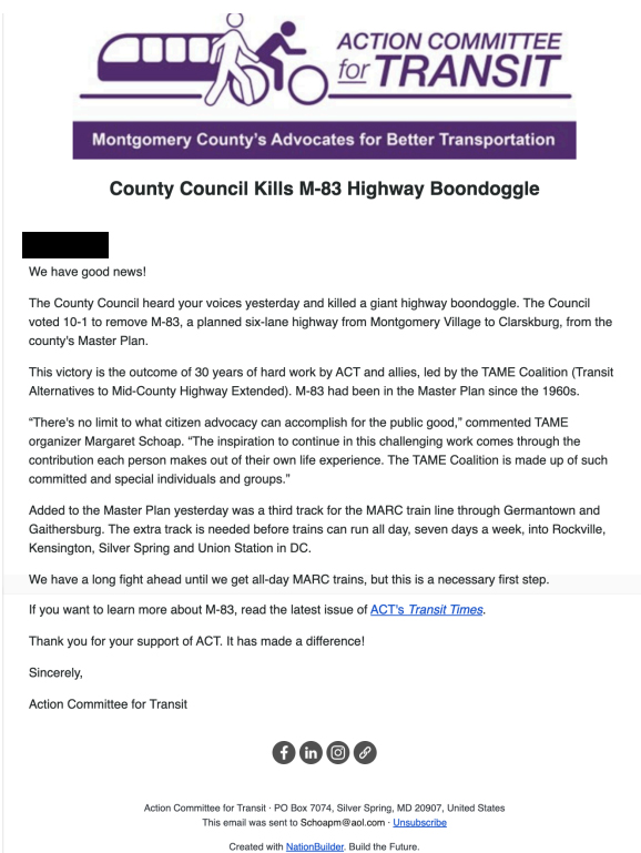 Montgomery County, Maryland shifts from a car-centric transportation system to a people-centric system. Local elected and appointed officials, working with residents including through the TAME Coalition, cancel the proposed M-83 highway and remove it from the Master Plan of Highways and Transitways. The funds saved by these actions are devoted to transit projects, telework, pedestrian, and bicycle projects, including for the Upcounty communities of Clarksburg, Germantown, Gaithersburg, and Montgomery Village. Guided by their commitments to racial equity and social justice, County officials fully support residents who choose to not own cars, or cannot afford cars, enabling them to travel to work, school, shopping, and park destinations via upgraded and extensive transit networks, and safe walkable and bikable streets.