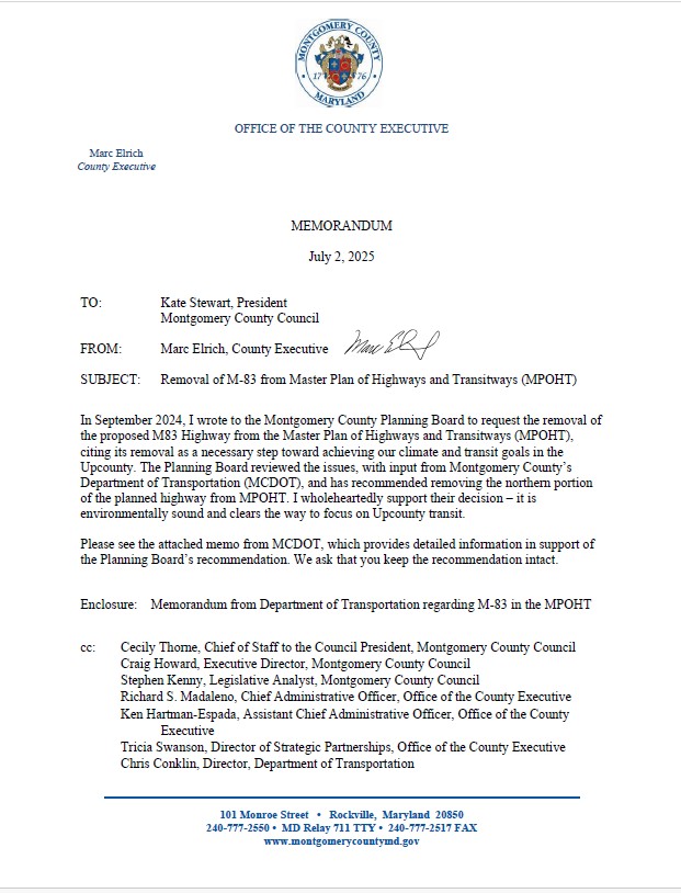Below are letters to the Montgomery County Council addressing the County’s 2024 update of its Master Plan of Highways and Transitways, and the necessary and achievable County Council action to remove M83 highway from this master plan. Click here to learn more about Montgomery County’s 2024 update of the Master Plan of Highways and Transitways. https://montgomeryplanning.org/planning/transportation/highway-planning/master-plan-of-highways-and-transitways/2024-technical-update/